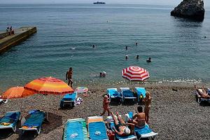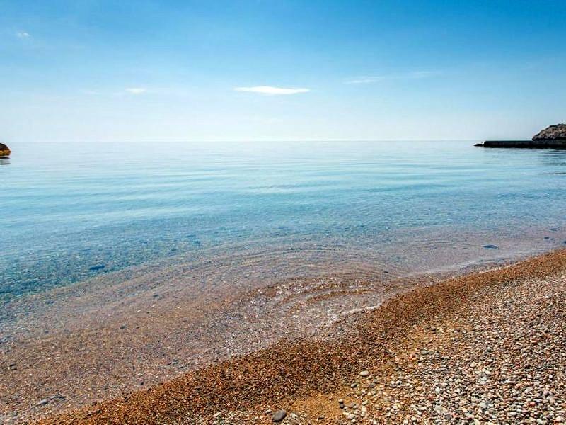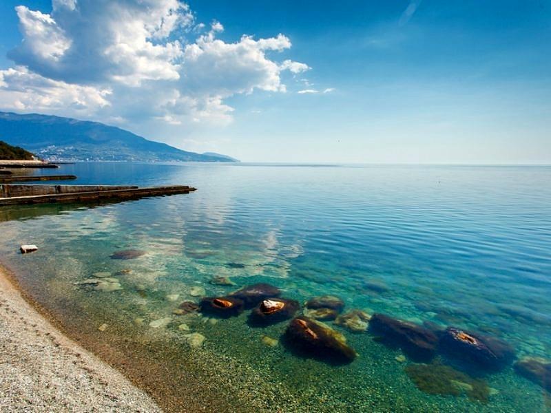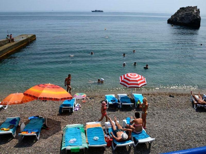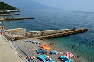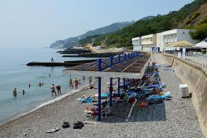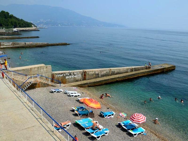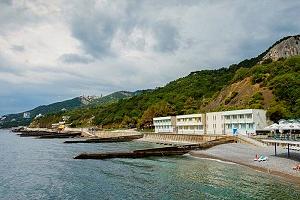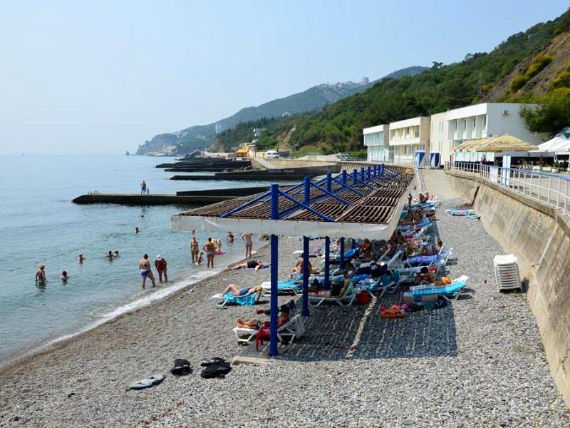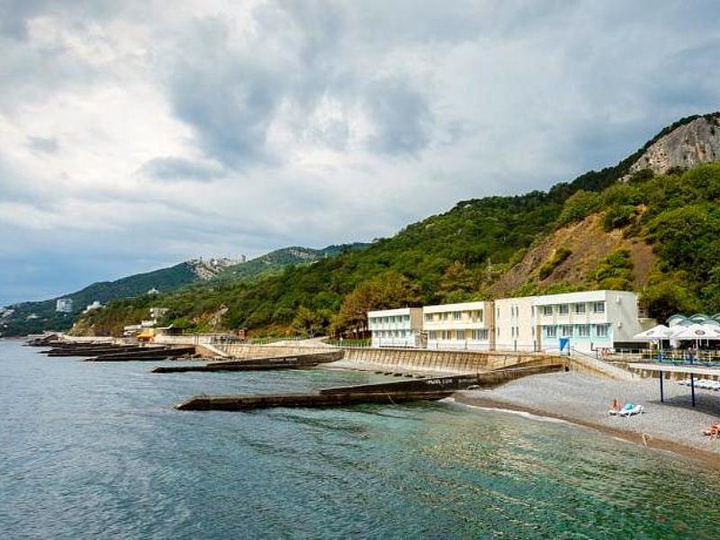 Собственный галечный, оборудованный теневыми навесами, кабинками для переодевания, лежаками, туалетами, душевыми. На территории пляжа расположена детская площадка, настольный теннис, открытый бассейн с подогреваемой морской водой. Спуск на пляж на лифте (от корпуса №2)